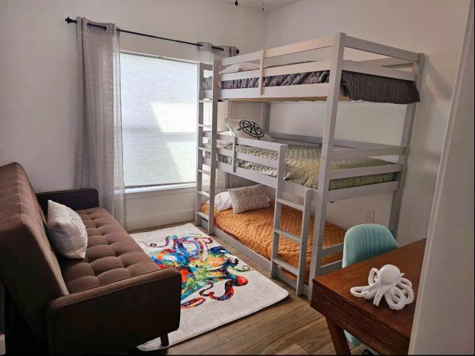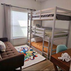 4 triple single bunk bed, 1 full couch futon.